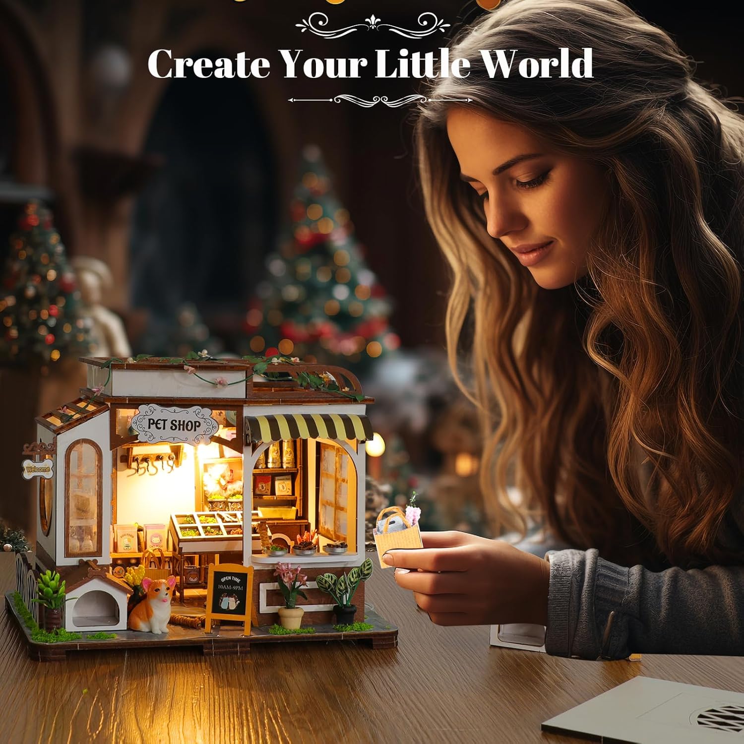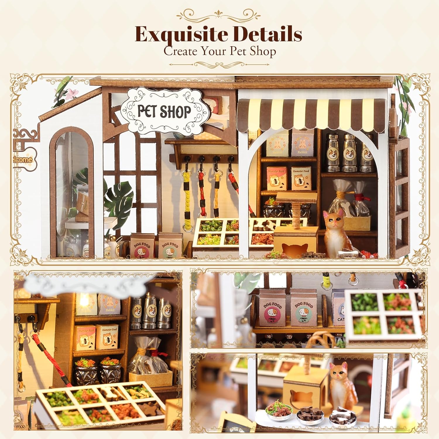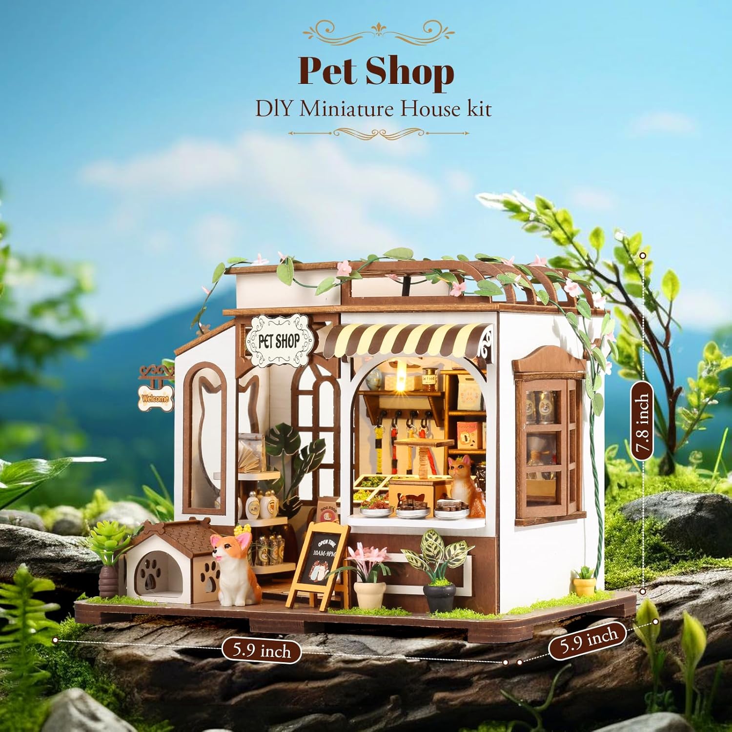 【2025 Newest Pet Shop Miniature House Kit】This DIY Pet Shop themed miniature house kit is a must – have for hobbyists and pet lovers. It comes with a detailed structure featuring a combination of white and brown walls, a wooden lattice roof, and a charming striped awning. The “PET SHOP” sign and welcome plaque add a realistic touch. Inside, there are shelves, counters, and various pet products on display, along with tables and chairs. The set also includes an adorable dog model, a pet house, and lovely decorative elements like green vines, pink flowers, potted plants, and a cute chalkboard.