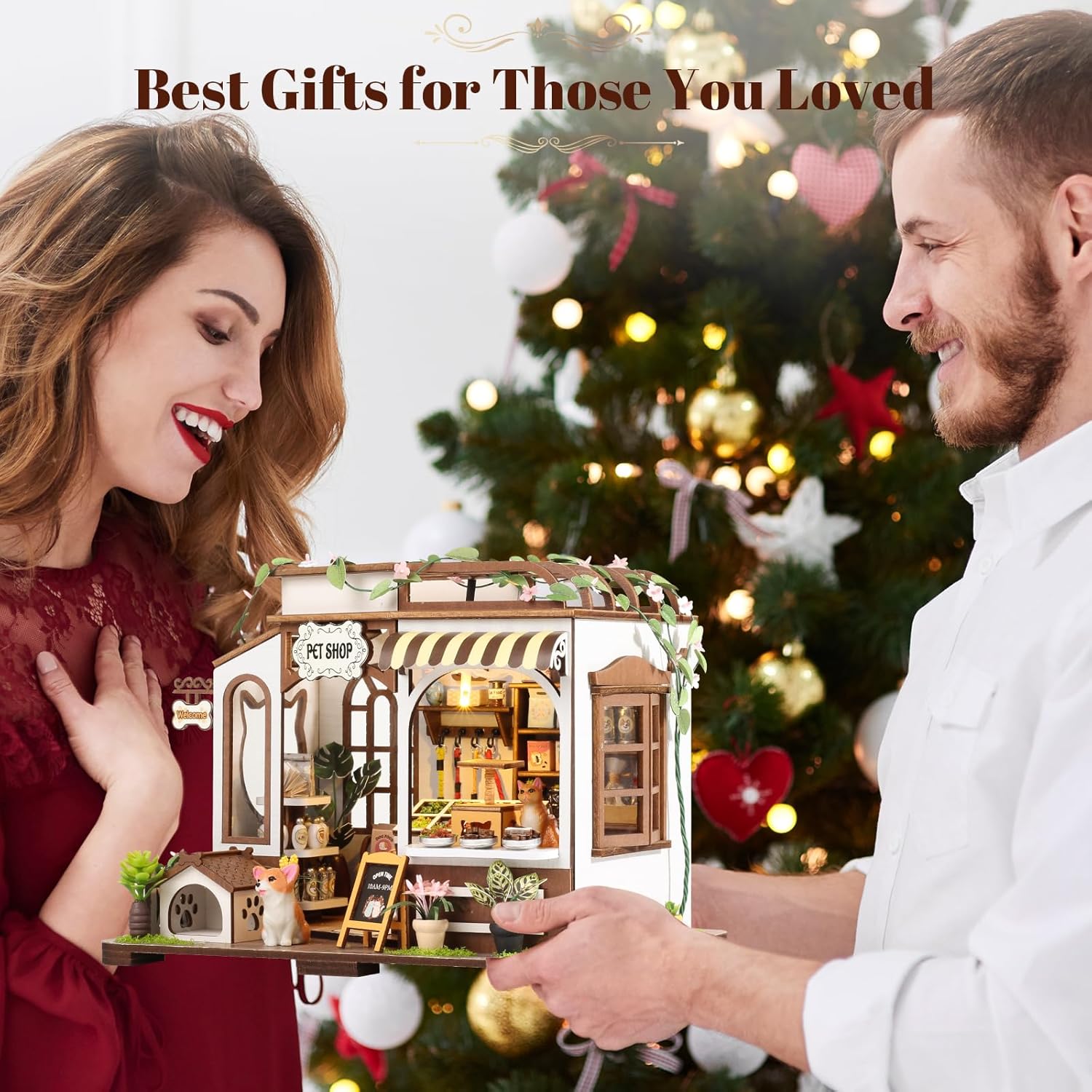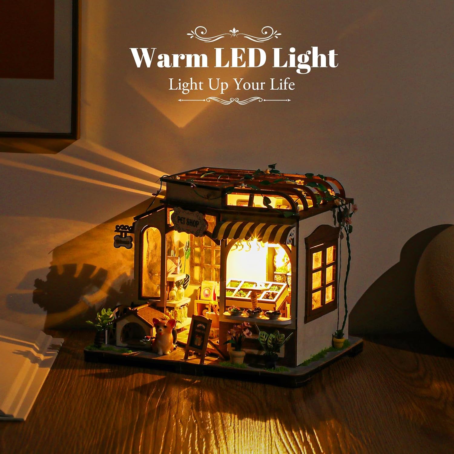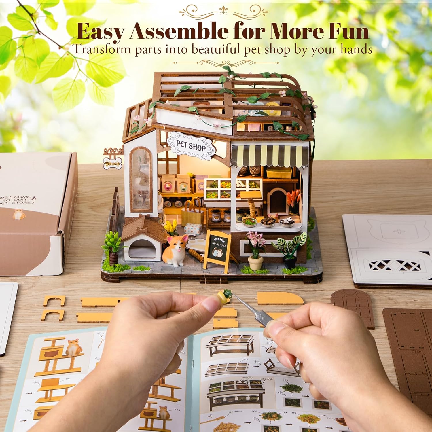 【2025 Newest Pet Shop Miniature House Kit】This DIY Pet Shop themed miniature house kit is a must – have for hobbyists and pet lovers. It comes with a detailed structure featuring a combination of white and brown walls, a wooden lattice roof, and a charming striped awning. The “PET SHOP” sign and welcome plaque add a realistic touch. Inside, there are shelves, counters, and various pet products on display, along with tables and chairs. The set also includes an adorable dog model, a pet house, and lovely decorative elements like green vines, pink flowers, potted plants, and a cute chalkboard.