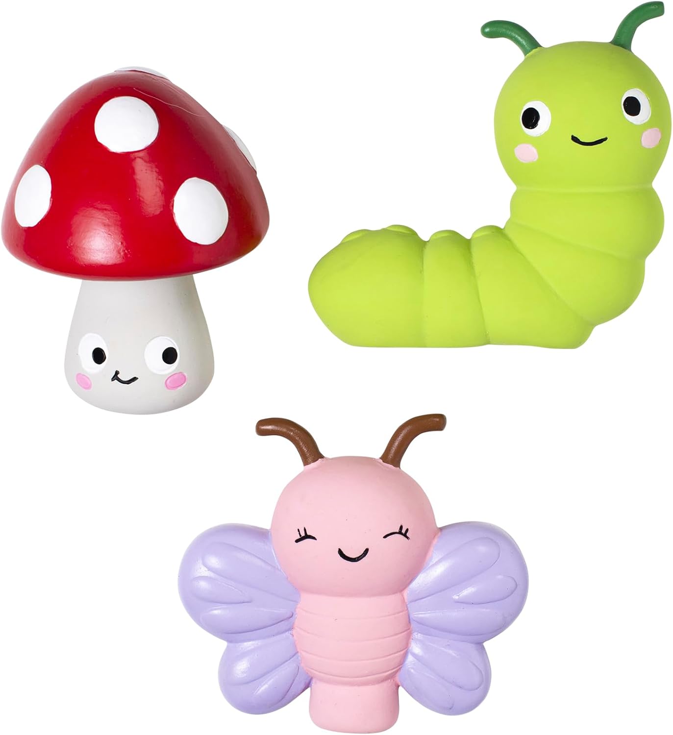 Approximate sizes – Mushroom: 3.5″ h x 2.75″ w x 2.75″ d; Butterfly: 3.25″ h x 3.75″ w x 1.25″ d; Caterpillar: 3.5″ h x 3.75″ w x 1.5″ d